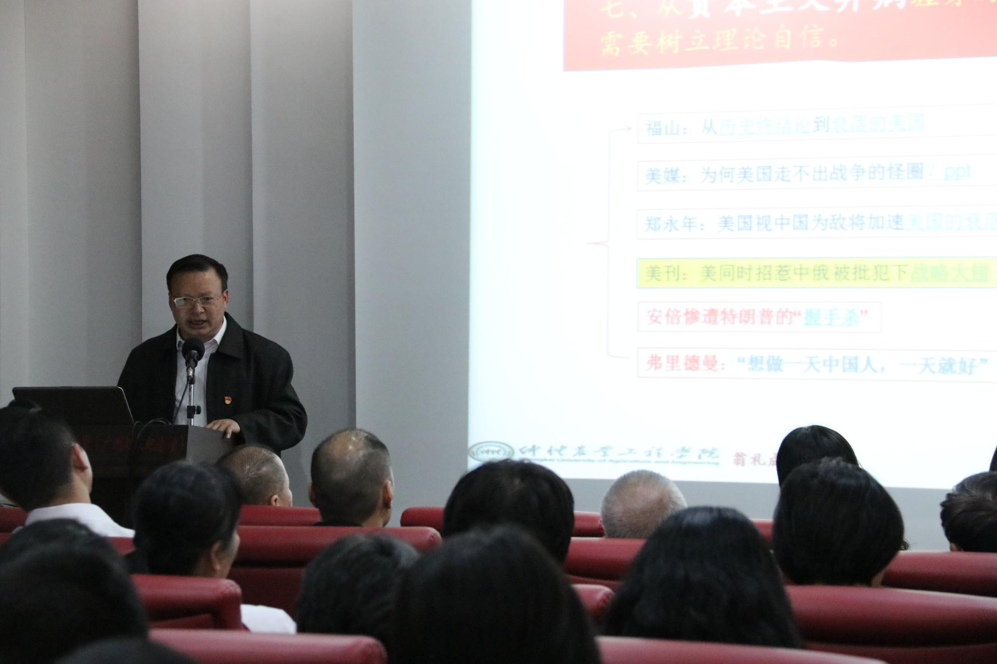 翁教授首先解读何谓理论自信。他认为,“理论自信”包含以下三点涵义:其一,信奉理论的科学性和价值性。其二,自觉以所信奉的理论为指导。其三,维护和发展所信奉的理论。他认为,从马克思主义问世170年的历史看,马克思主义理论的科学性和价值性不断被实践所证明;从二战以来的历史看,理论自信是一个国家、民族软实力的重要组成部分;从新时代改革发展稳定的大局看,理论自信是维护国家长治久安的思想武器;从建党98年的历史看,理论自信是我们党取得革命、建设和改革一个又一个成就的根本原因;从解决当前社会主要矛盾的角度看,理论自信是解决不平衡不充分问题的必然选择;从民族复兴大局看,理论自信是实现民族伟大复兴中国梦的必然选择;从资本主义弊病缠身的现实看,我们共产党员更需要树立理论自信。