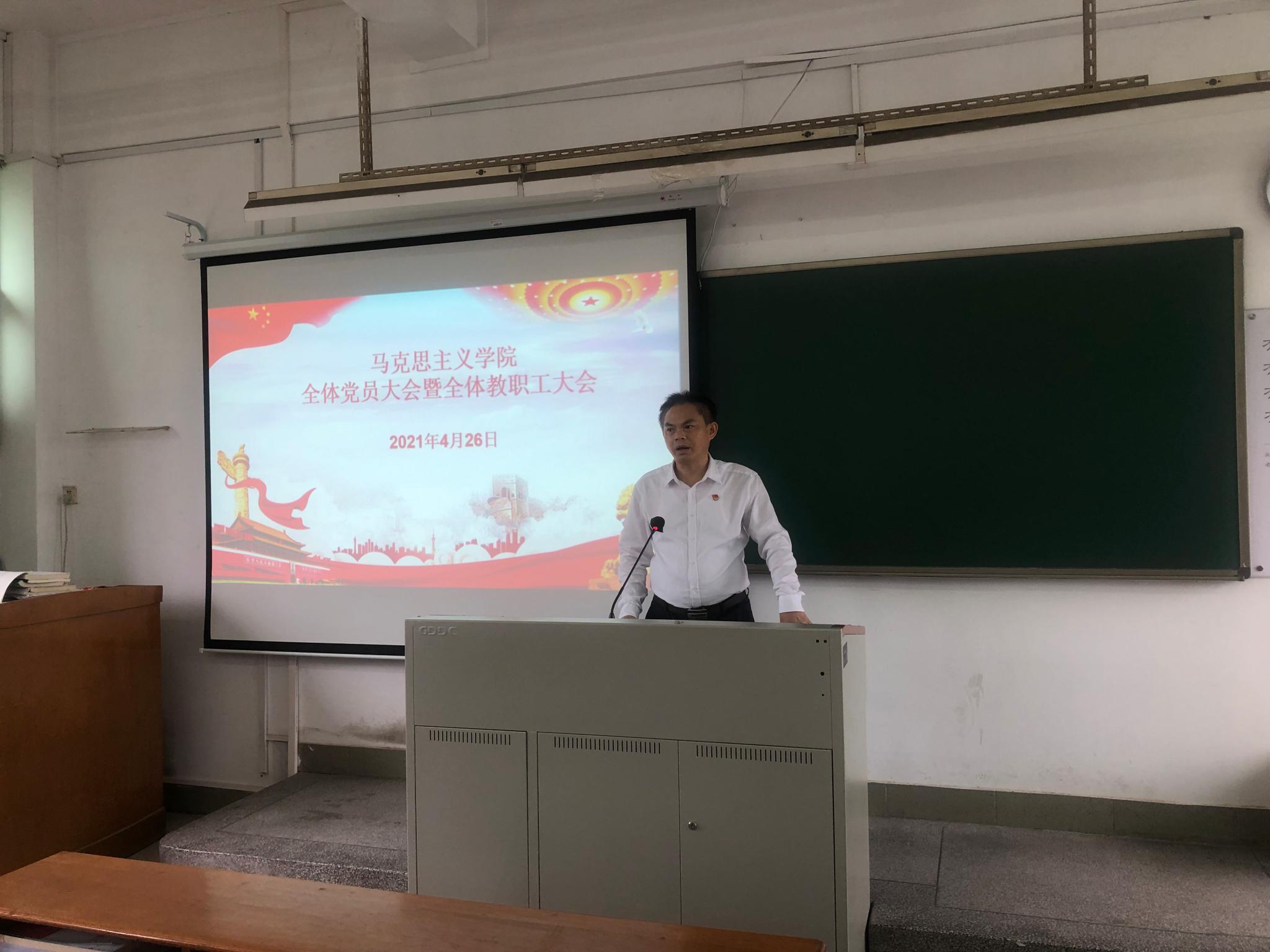 2021年4月26日上午,马克思主义学院在海珠校区教学楼904课室召开了全体党员暨全体教职工大会。专题传达了习近平总书记系列重要讲话精神及《中共广东省委印发<关于建立健全坚决落实“两个维护”十项制度机制的意见>的通知》等文件精神。KY开元集团官网入口院长蔡立彬主持会议并主讲了“百年大党的红色气质:中国共产党人的精神谱系”的专题党课。KY开元集团官网入口副院长秦抗抗主讲了“学习党的光辉历史,传承红色基因”的专题党课。随后,全体党员及教职工重走了中共广东省委书记李希同志考察KY开元集团官网入口的路线。