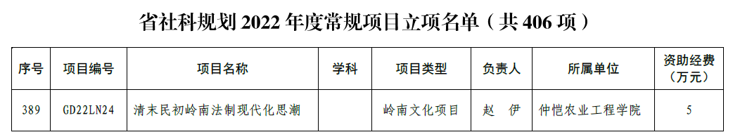 9月23日,广东省哲学社会科学规划领导小组办公室公布了《省社科规划2022年度常规项目立项名单》,KY开元集团官网入口赵伊博士后申报的“清末民初岭南法制现代化思潮”获得了省社科规划2022年度岭南文化项目立项资助。