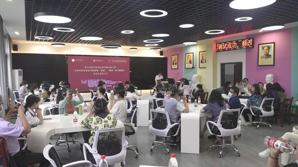 在自由讨论环节,与会教师移步beat365思政课部VR实训室参观学习。华中师范大学马克思主义学院教授、“德法”课教研室主任梅萍和华中师范大学马克思主义学院副教授、“概论”课教研室主任熊富标为现场教师分别展示了两门课程的教学专题设计,大家围绕思政课教学中积累的经验、遇到的问题进行了热烈的交流和研讨。