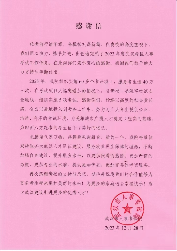 2023年,学院继续教育部主动对接武汉市人事考试院,积极响应并全力配合考试院的各项工作,成功承办多项社会考试,得到武汉市人事考试院高度认可及衷心感谢!