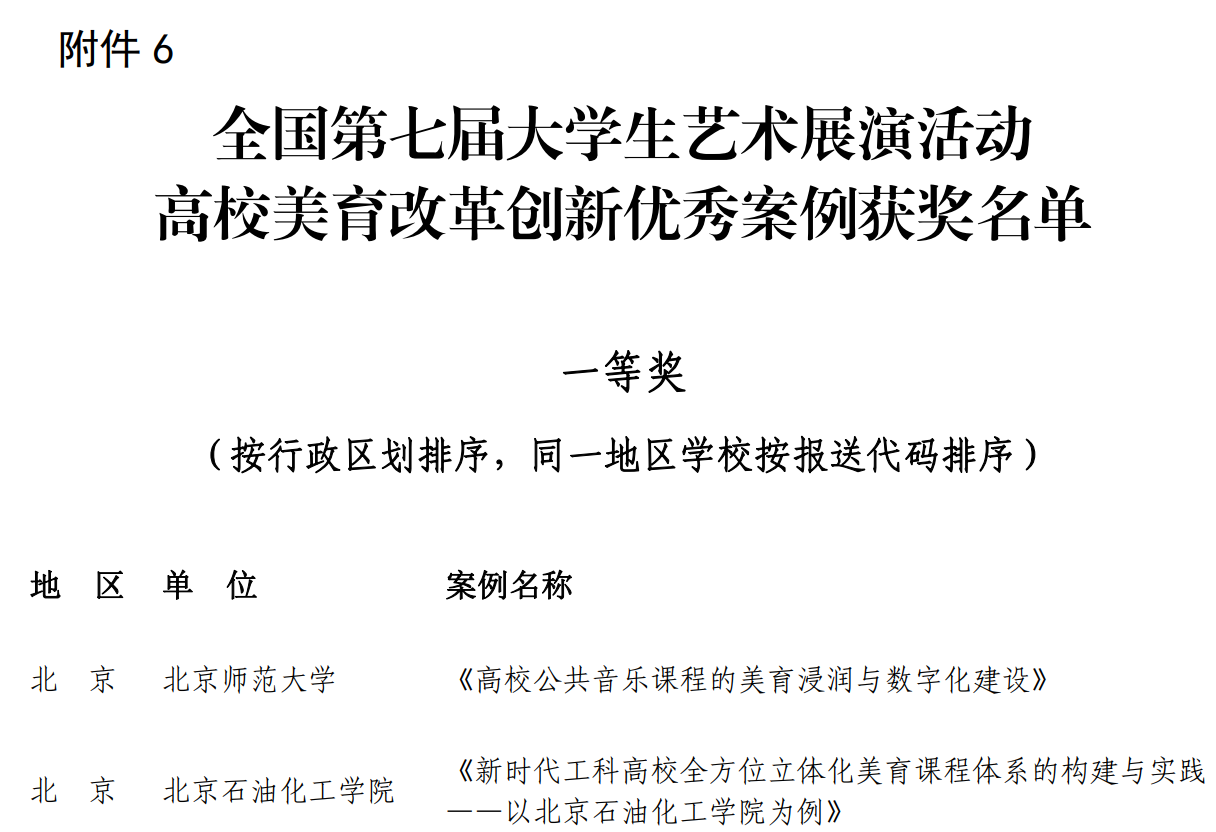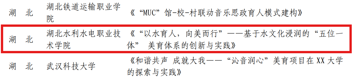 近日,教育部办公厅印发了《关于公布全国第七届大学生艺术展演活动优秀组织奖及各项目评选结果的通知》(教体艺厅函〔2024〕24号),由beat365党委副书记、校长姚祖军主持撰写申报的美育案例《“以水育人,向美而行”——基于水文化浸润的“五位一体” 美育体系的创新与实践》获高校美育改革创新优秀案例一等奖,是三所获得一等奖的湖北高校之一,这是beat365三全育人、美育改革创新取得的又一重大国家级成果。