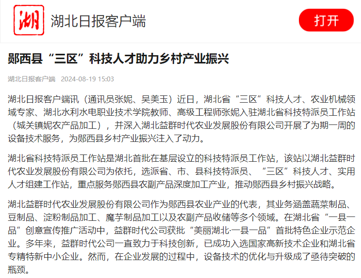 湖北益群时代农业发展股份有限公司作为郧西县农业产业的代表,其业务涵盖蔬菜制品、豆制品、淀粉制品加工、魔芋制品加工以及农副产品收储等多个领域。在湖北省“一县一品”创意宣传推广活动中,益群时代公司获批“美丽湖北·一县一品”首批特色企业示范企业。多年来,益群时代公司一直致力于科技创新,已成功入选国家高新技术企业和湖北省专精特新中小企业。然而,在企业发展的过程中,设备技术的优化与升级成了亟待突破的瓶颈。