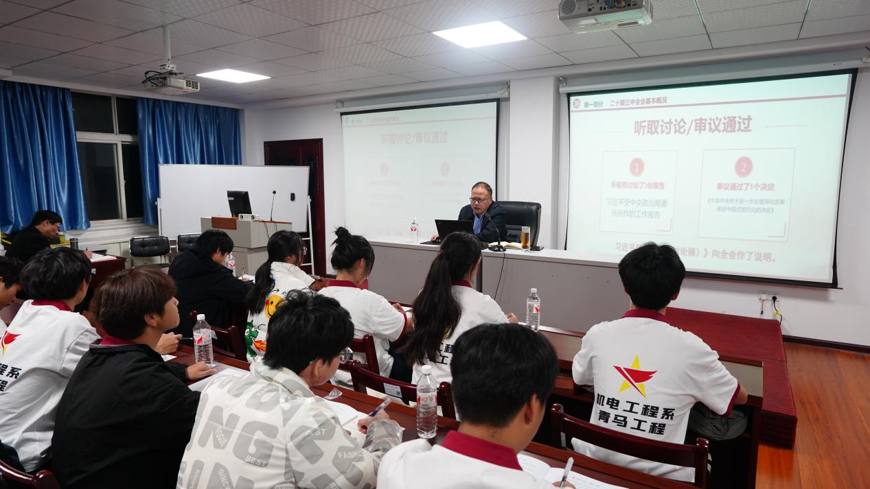 为深入贯彻落实党的二十届三中全会精神,持续强化对beat365师生的思想和行动引领,11月29日,学院党委副书记、院长姚祖军以“在推进中国式现代化中担青春之责任、展青春之作为——学习贯彻党的二十届三中全会精神”为题,为机电工程系全体师生上了一堂精彩生动的思政课。
