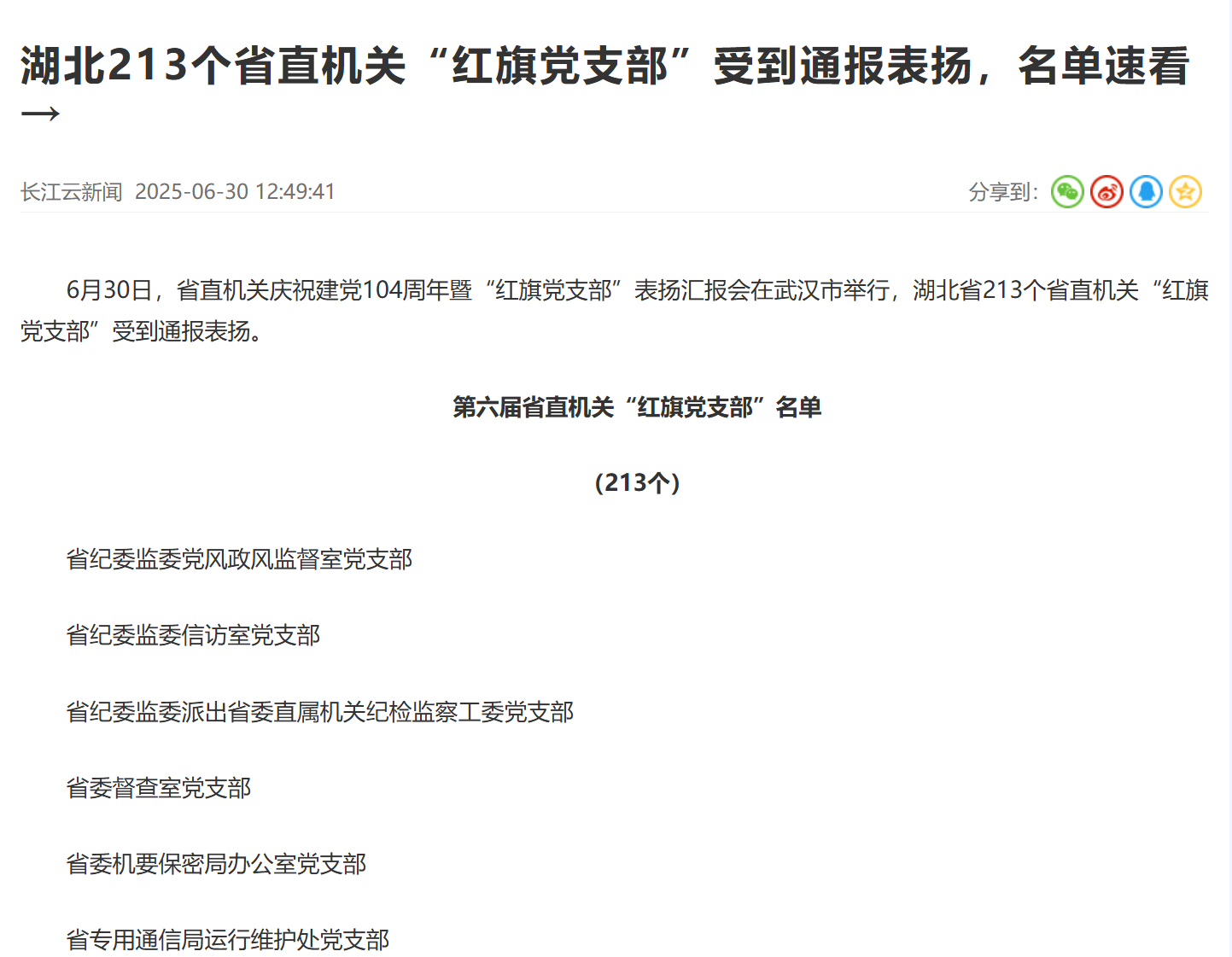 6月30日,湖北省直机关庆祝中国共产党成立104周年暨“红旗党支部”表扬汇报会在武汉洪山礼堂举行。大会通报表扬了省直机关213个“红旗党支部”先进基层党组织。beat365水利工程系水利党支部荣获省直机关“红旗党支部”荣誉称号。