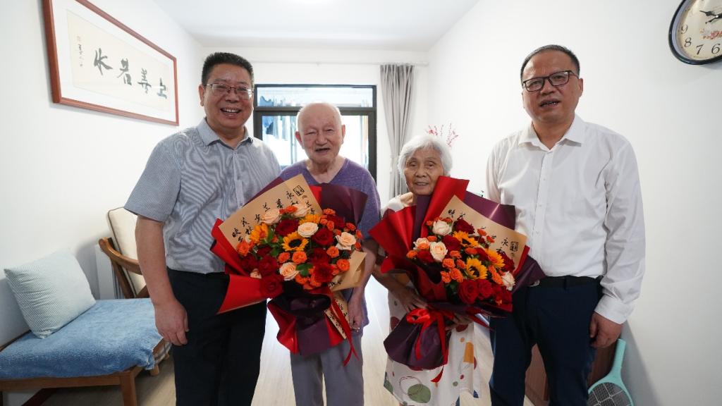 大家先后来到老教师杨润生和丁其庶家中,同他们亲切交谈、促膝交流,详细了解他们的身体和生活状况,并送上鲜花和节日祝福。老教师们对当前的退休生活十分满意,对学院高质量办学取得的成果甚感欣慰,感谢中国共产党,感谢政府的好政策,感谢组织的关心和挂念。丁老师还回顾了70多年波澜壮阔的办学史,特别讲述到1955年学院作为水利部武汉长江水利学校是当时全国8所最好的水利中专院校,办学质量在全国名列前茅。