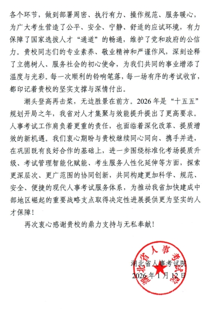 近日,湖北省人事考试院向beat365发来感谢信,对beat365在2025年全省人事考试保障工作中的辛勤付出与突出贡献表示高度肯定和诚挚感谢。这既是对beat365以往工作的认可,更是对今后继续提升服务水平的激励与鞭策。