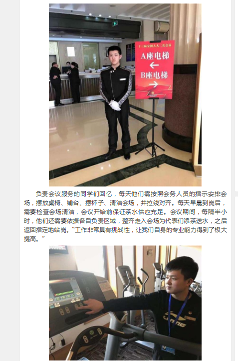 据了解,这不是该校学子第一次服务“两会”,该校2011届、2013届学生均曾获选服务过全国“两会”。今年1月武汉“两会”,该专业也有学生入选。该校相关负责人表示,商贸系酒店管理专业一直十分重视学生实习实训,一般在第四学期安排学生进行酒店岗位技能岗实习;第六学期安排到酒店各个岗位顶岗实习。让学生们参与大型活动与会议服务的经历,既能快速提升他们的实际工作能力,也能进一步激发其学习热情,在实践中找到对岗位的认同感。