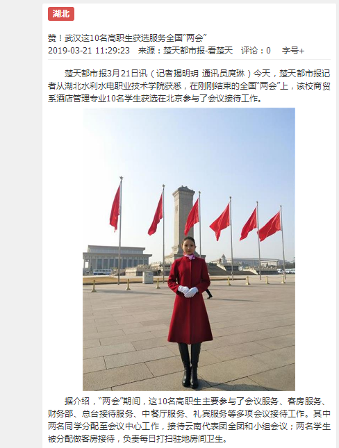 楚天都市报3月21日讯(记者揭明玥 通讯员庹琳)今天,楚天都市报记者从beat365平台官方网站获悉,在刚刚结束的全国“两会”上,该校商贸系酒店管理专业10名学生获选在北京参与了会议接待工作。