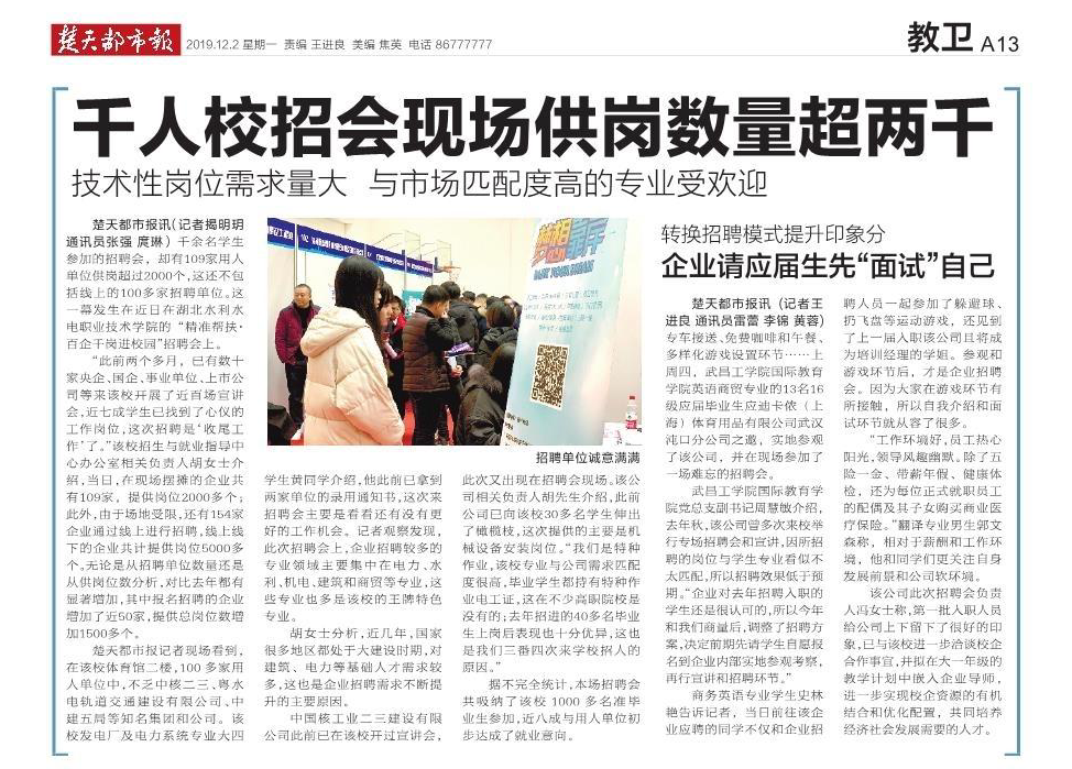 (庹琳)12月2日,楚天都市报报道beat3652020届毕业生校园招聘会。
