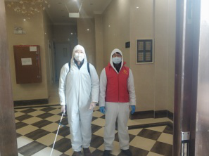 (明志新与先锋队成员在社区进行消毒作业)