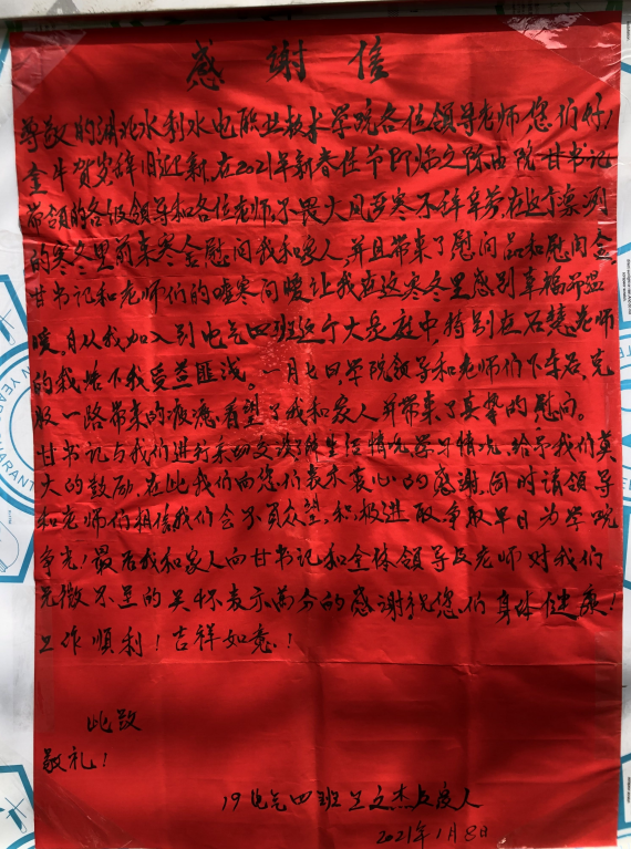 最后,我和家人向甘书记和全体领导及老师对我们无微不至的关怀表示满分的感谢!祝您们身体健康!工作顺利!吉祥如意!