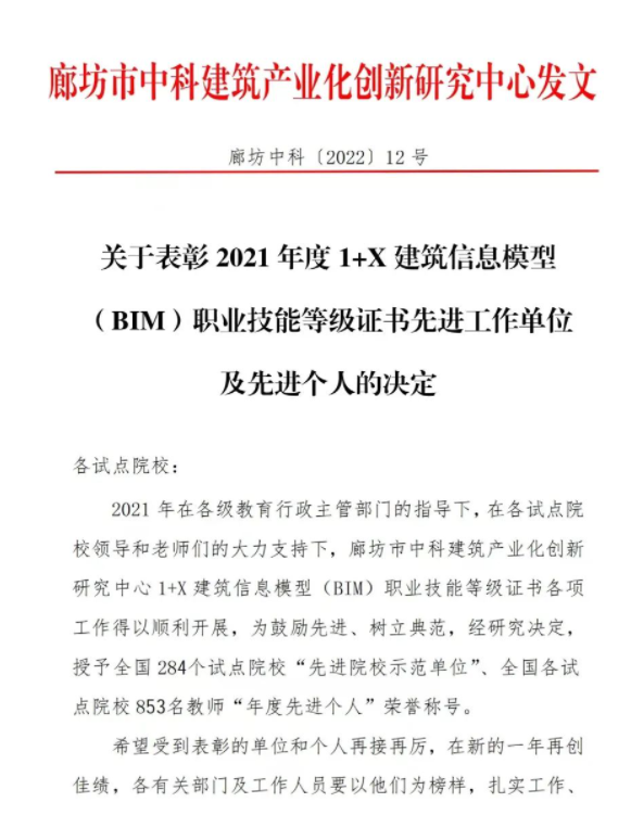 (建筑工程系)近日,《关于表彰2021年度1+X建筑信息模型(BIM)职业技能等级证书先进工作单位及先进个人决定》发布,beat365获评“先进院校示范单位”荣誉称号。
