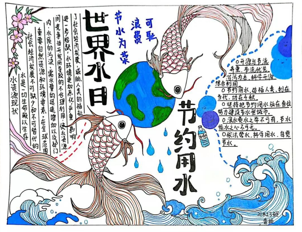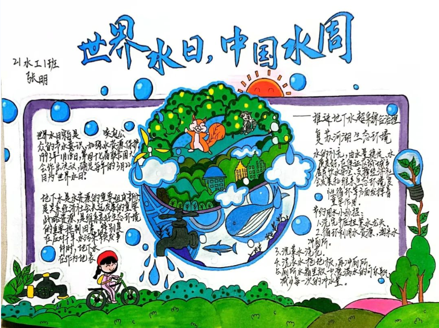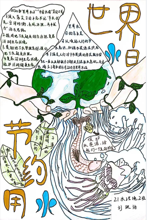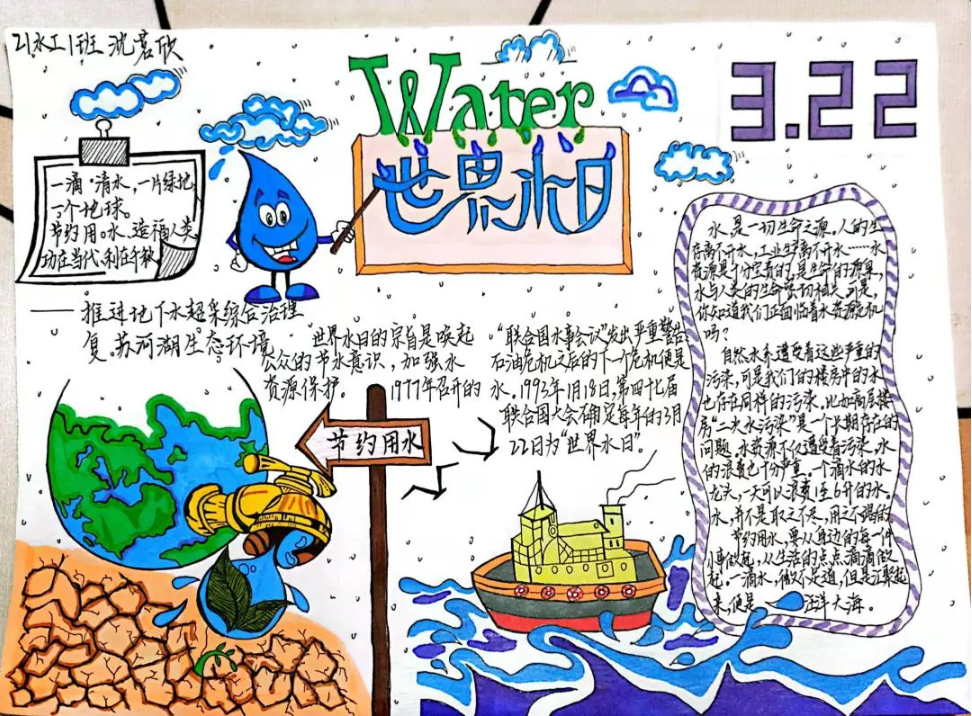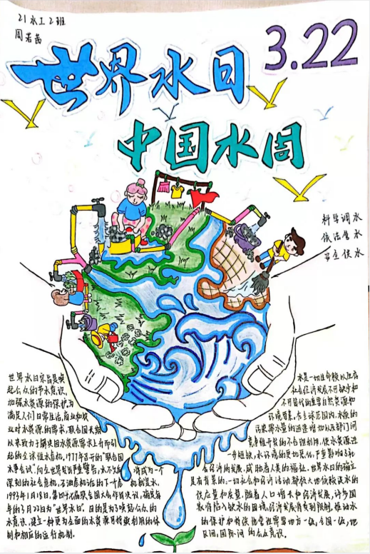 (水利工程系)2022年3月22日是第三十届“世界水日”,3月22日至28日是第三十五届“中国水周”。在此期间,学院水利工程系组织开展了“推进地下水超采综合治理 复苏河湖生态环境”手抄报、宣传海报作品征集活动,学子们自制精美作品宣传节约水、爱护水的理念,形成了节约用水,保护水资源的良好氛围。