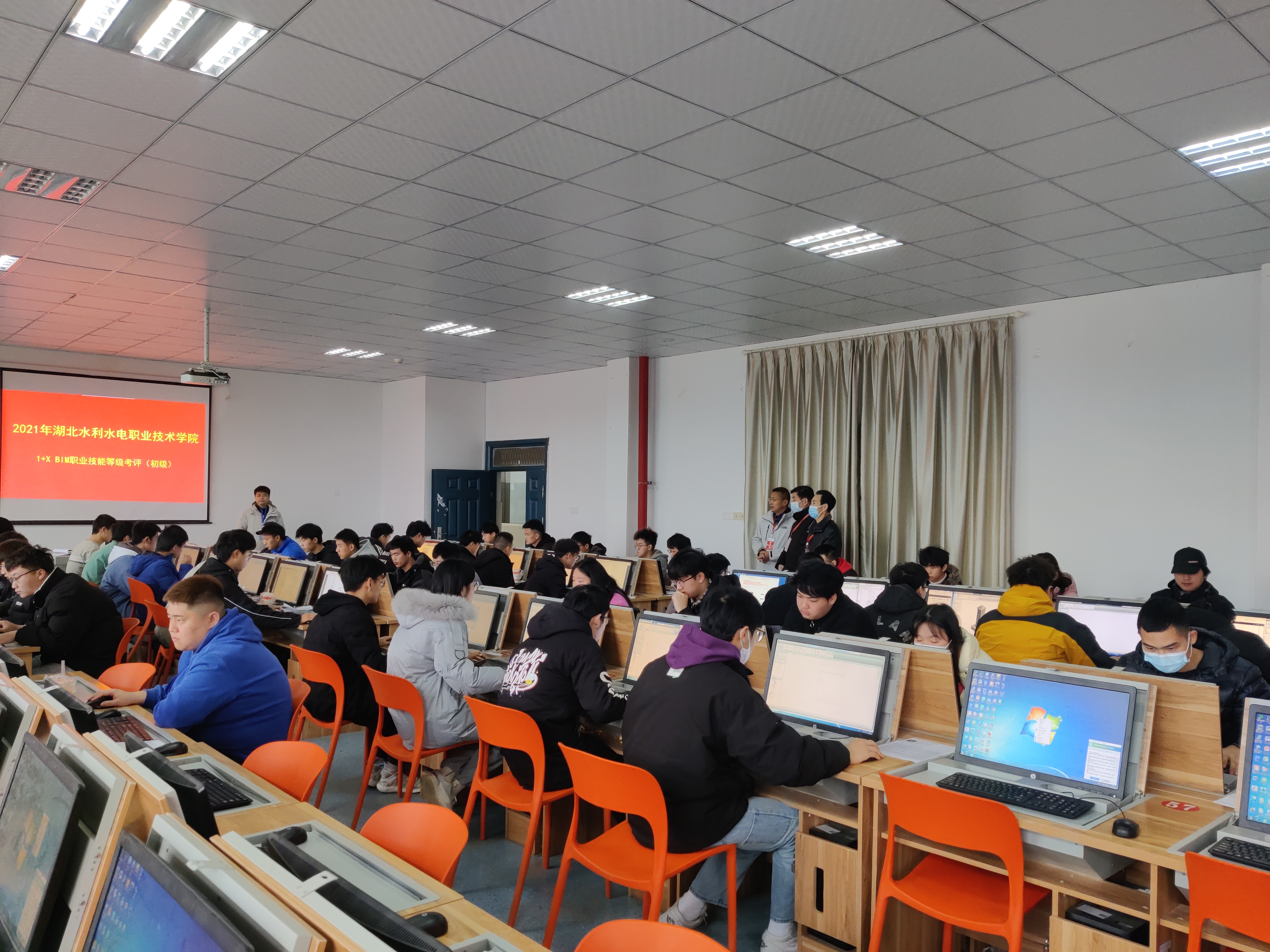 (朱菁 罗中)12月25日,2021年“1+X”BIM职业技能等级考试在beat365考点开考。此次考试由学院负责组织和实施,省建协负责主考和技术支持,考试采用机考形式进行,历时三个小时,考场实行全程录像监控,考生全程人脸识别,考试结果由系统平台自动打分,公平公开公正。省建筑业协会领导专程来到beat365考点现场进行考试巡视。