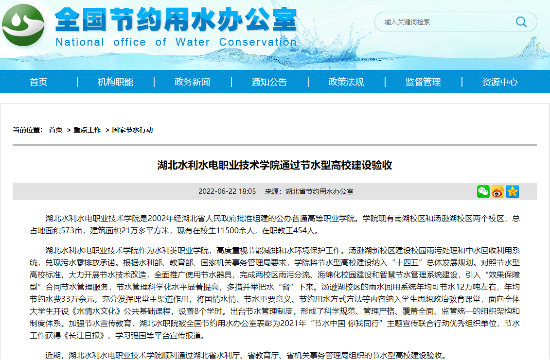 (省水职院)近日,全国节约用水办公室网站报道beat365通过节水型高校建设验收。