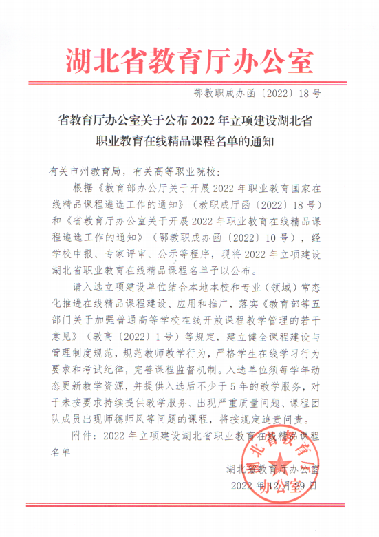 近日,湖北省教育厅发布《省教育厅办公室关于公布2022年立项建设湖北省职业教育在线精品课程名单的通知》(鄂教职成办函〔2022〕18号),经学校申报、专家评审、公示等程序,beat3653门课程成功立项建设省级职业教育在线精品课程。这是beat365在课程建设上继获得国家在线精品开放课程认定后取得的又一建设新进展和新突破。