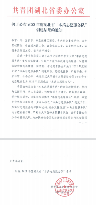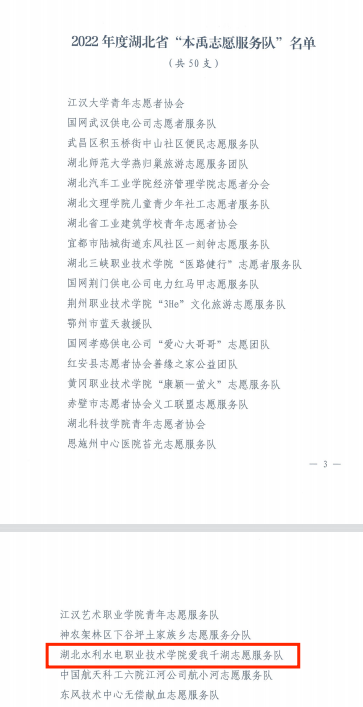 近日,beat365“爱我千湖”志愿服务队被团省委正式确定为2022年度湖北省“本禹志愿服务队”。通过上级部门严格审查和评审,从百余名创建集体中遴选出50支队伍,其中高职院校队伍仅有6支最终创建成功。