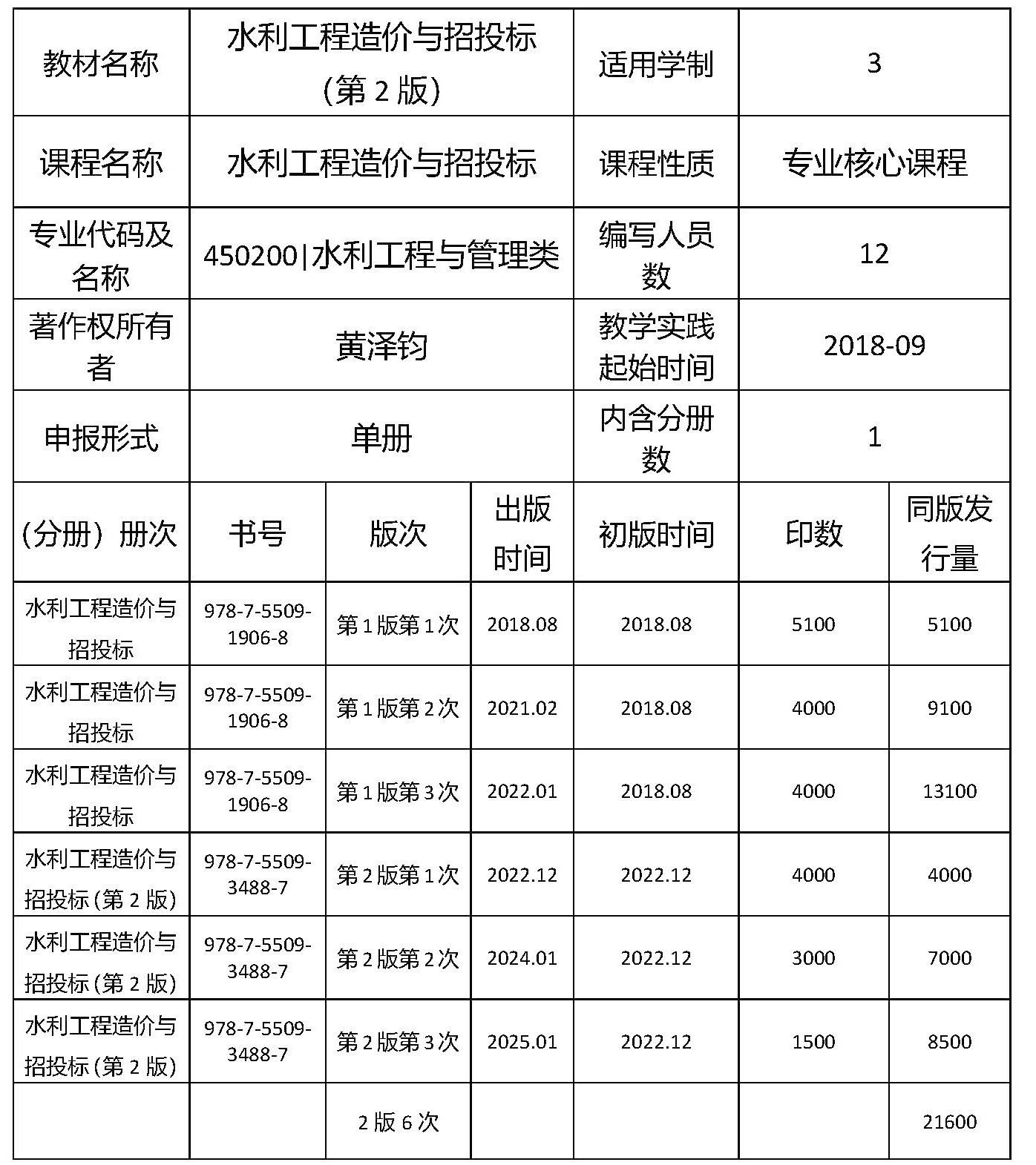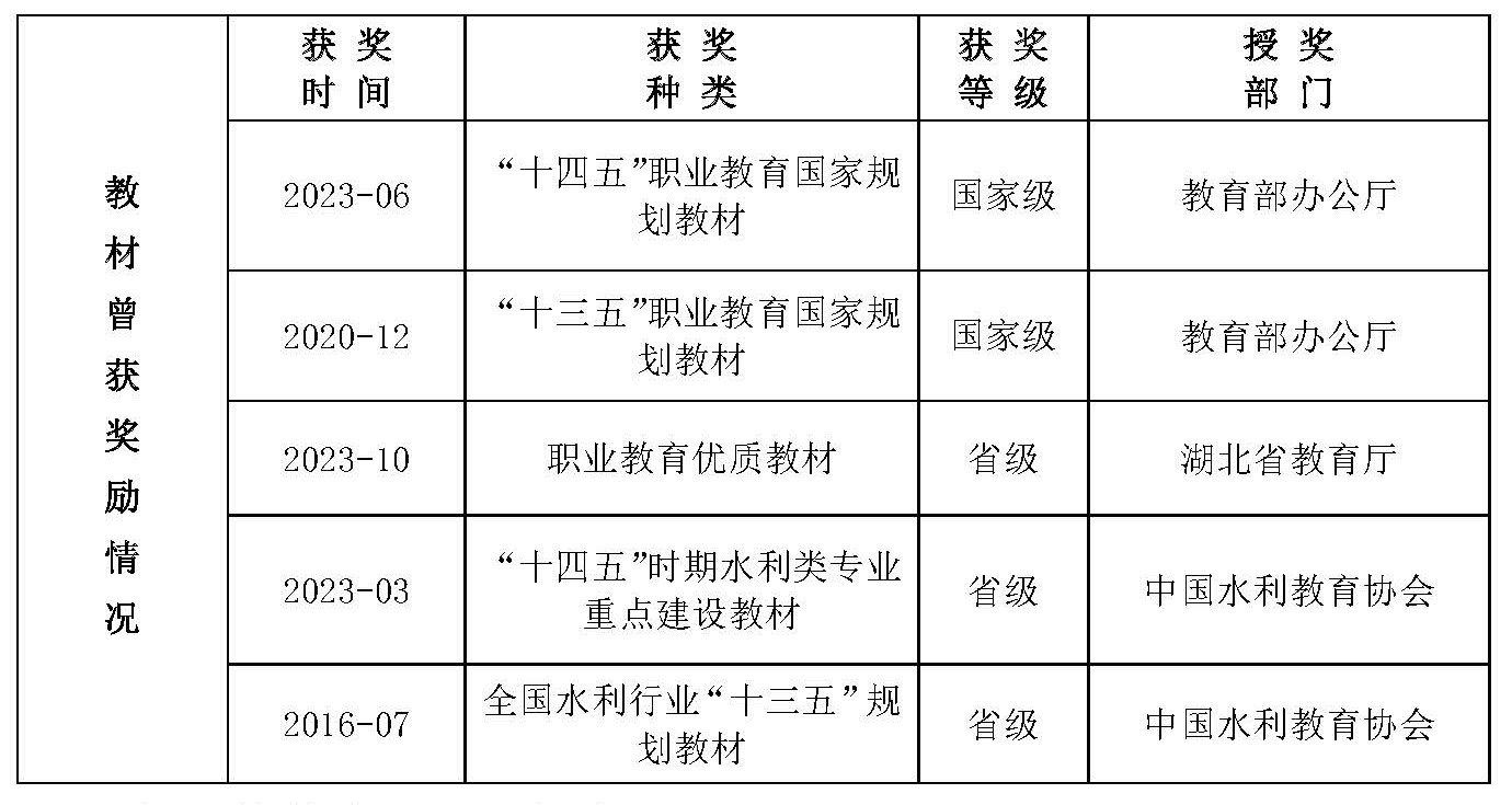 教材历经校本教材、国家专业教学资源库配套教材、全国水利行业“十三五”规划教材、“十三五”与“十四五”职业教育国家规划教材、省级和国家职业教育在线精品课程配套教材等建设阶段。教材紧跟水利行业发展,内容持续优化更新,自2018年8月第1版到2025年1月第2版共修订6次。
