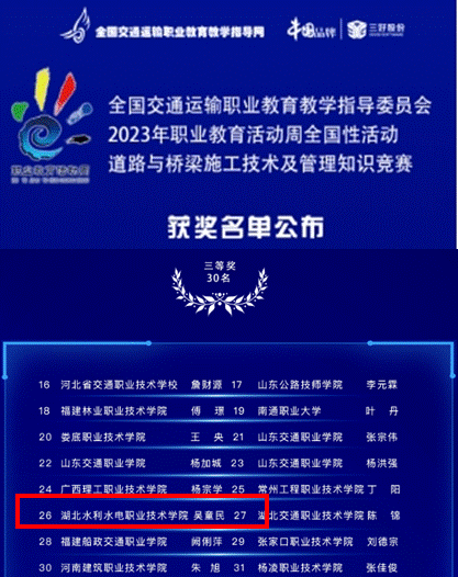 本次大赛以职教周为载体,通过专业活动,有力促进了道路桥梁专业职业教育的发展。大赛内容包括道路桥梁构造与识图、施工技术、项目管理、质量检测与验收等相关知识,比赛形式为线上测试。大赛汇集了来自全国150余所职业院校的近3000名学生参赛。在本次比赛中,我校建筑系21道桥1班吴童民同学充分备赛,沉着应战,在本次竞赛中荣获三等奖,学院荣获优秀组织奖。