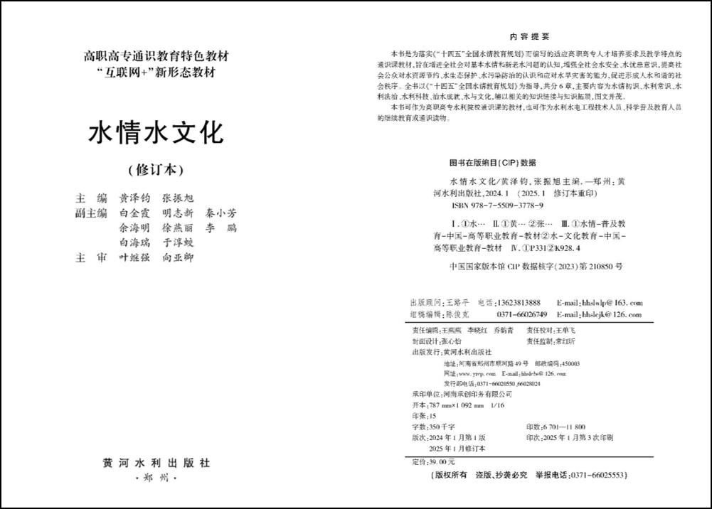《水情水文化》于2024年1月出版发行,为高职高专通识教育特色教材,是“互联网+”新形态教材。教材全面落实《“十四五”全国水情教育规划》指导思想,旨在增进全社会对基本水情和新老水问题的认知,增强全社会水安全、水忧患意识,提高社会公众对水资源节约、水生态保护、水污染防治的认识和应对水旱灾害的能力,促进形成人水和谐的社会秩序。全书共6章,主要内容为水情初识、水利常识、水利法治、水利科技、治水成就、水与文化,辅以二维码知识链接与知识拓展,图文并茂。