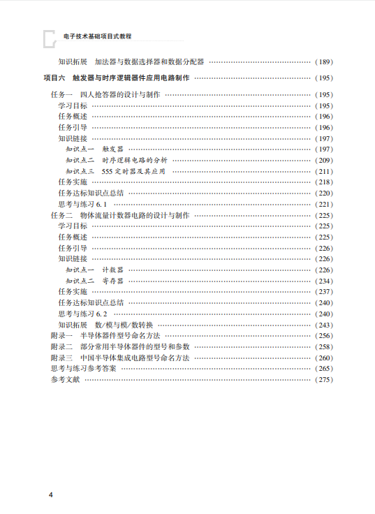 《电子技术基础项目式教程》共分6个项目, 项目一为半导体器件的识别与检测、项目二为小信号电压放大电路的制作与调试、项目三为集成运算放大器应用电路制作、项目四为小功率直流稳压电源的制作与调试、项目五为门电路和组合逻辑器件应用电路制、项目六为触发器与时序逻辑器件应用电路制作。