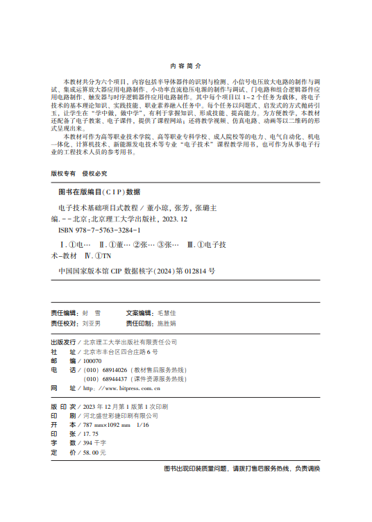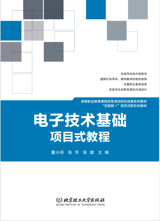 《电子技术基础项目式教程》于2023年12月出版发行。本教材的编写于2017年开始准备,教材编写团队不断积累提炼相关电子大赛及“1+X集成电路开发与测试”技能等级证书对电子技术知识、技能及素质要求,以立足电子产品生产岗位能力的培养并为学生后续专业课奠定坚实基础的目标而编写。2020年10月正式定稿,2021~2023年通过定稿的项目内容形成教案、PPT进行试教试用。通过试教试用反馈建议,对项目内容进行了微调与瘦身,引入与生产、生活实际有密切联系、具有典型性的案例作为项目内容,契合国家“双高计划”建设要求, 构建了“工学结合、项目引领、任务驱动”的“岗课赛证创”五维融通的“教、学、做”一体式教材。