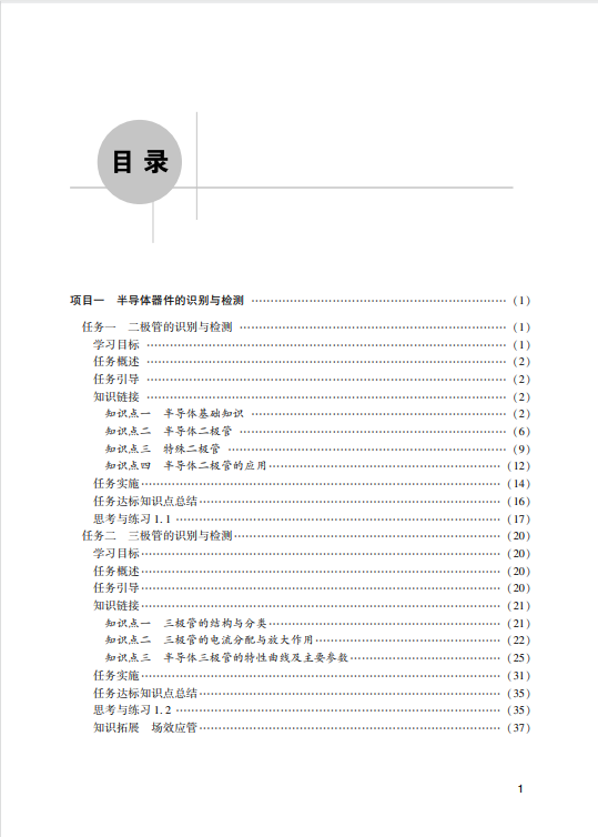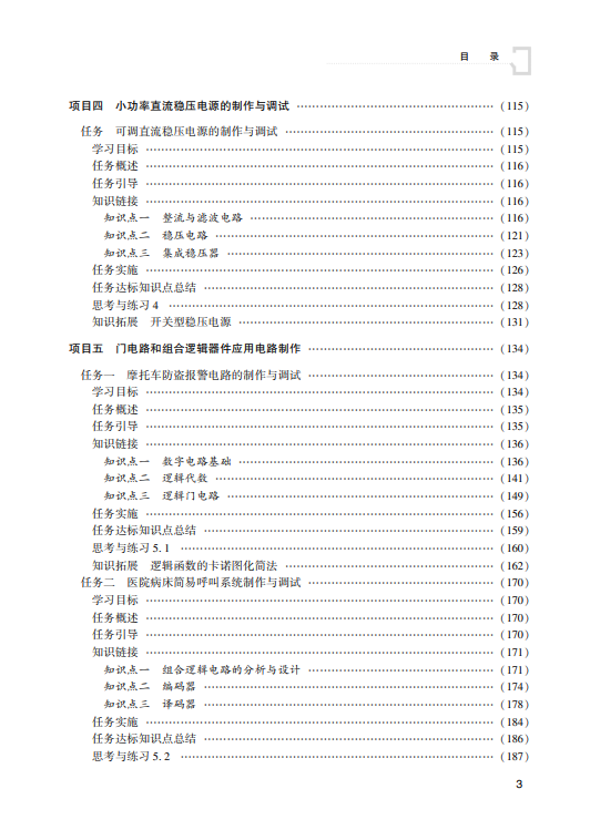教材六个项目编写采用统一编写体例,每个项目包含1~2个常用电子产品的实践任务,每个任务包括任务概述、任务引导、知识准备、任务实施过程、知识拓展的“教学做一体化”环节,学生 “学做结合”,知识及技能训练贯穿始终,具有职业教育特色。