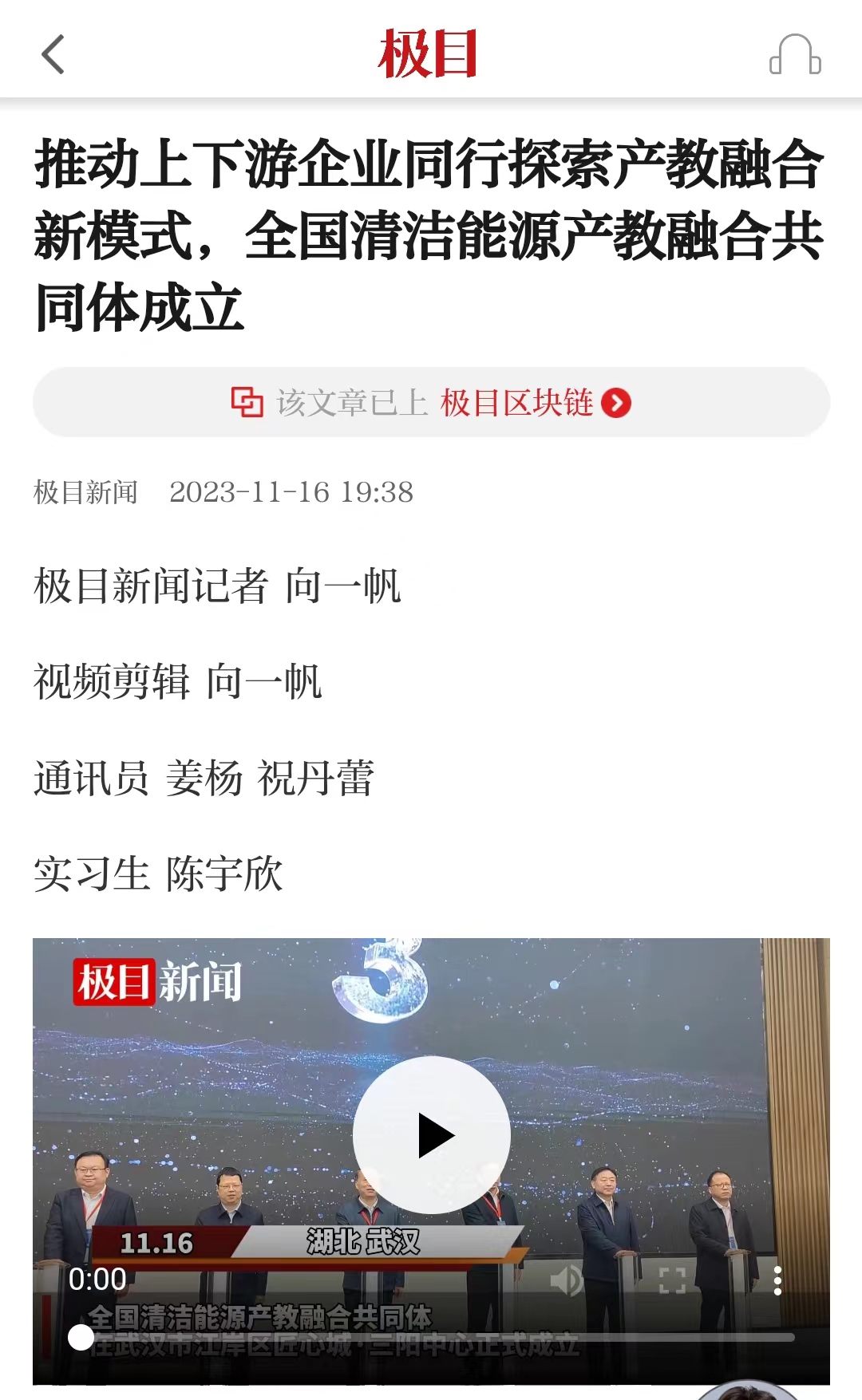 11月16日,极目新闻以《推动上下游企业同行探索产教融合新模式,全国清洁能源产教融合共同体成立》为题,对beat365和相关单位牵头成立全国清洁能源产教融合共同体进行报道。