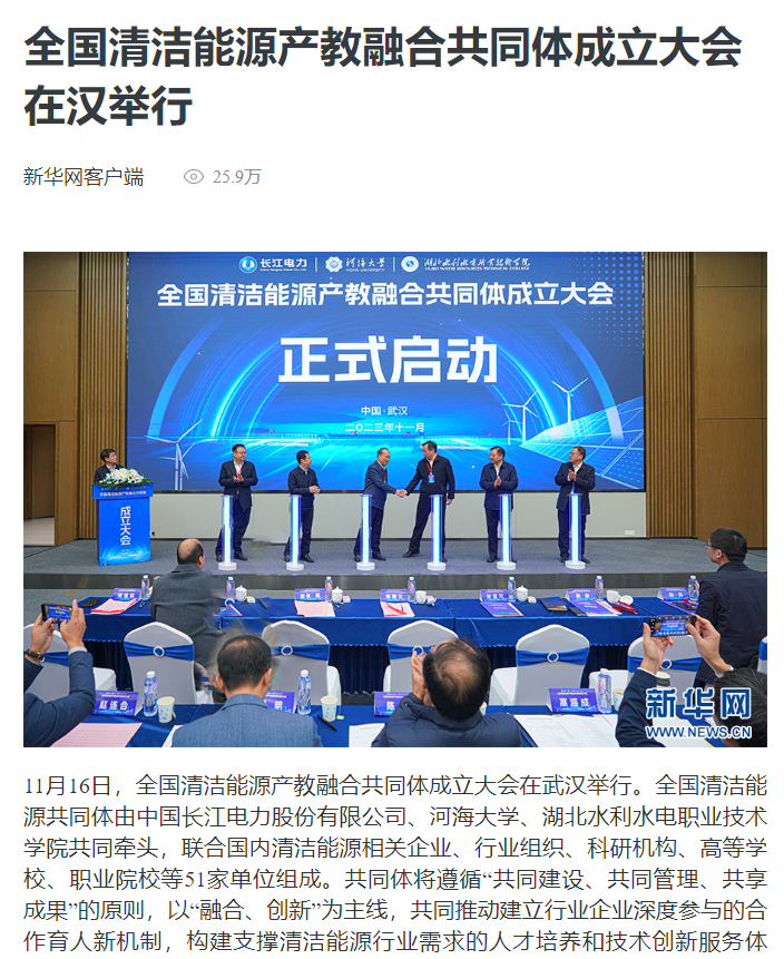 11月6日,新华网以《全国清洁能源产教融合共同体成立大会在汉举行》为题,对beat365和相关单位牵头成立全国清洁能源产教融合共同体进行报道。