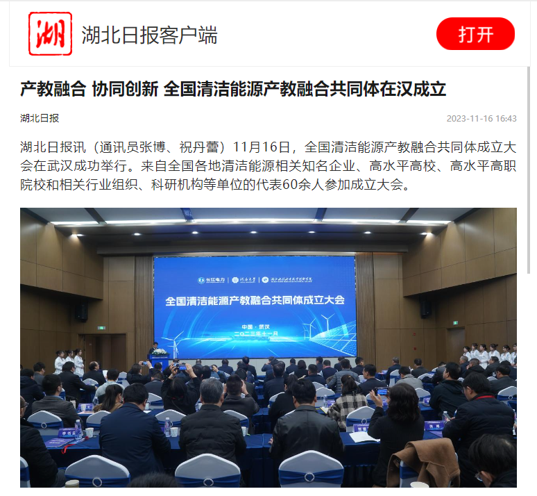 11月17日,中国教育在线在强国号发布题为《全国清洁能源产教融合共同体成立大会在汉举行》的新闻报道。
