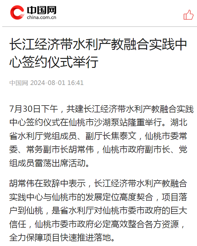 8月1日,长江云以《长江经济带水利产教融合实践中心签约仪式在湖北仙桃举行》为题进行报道。