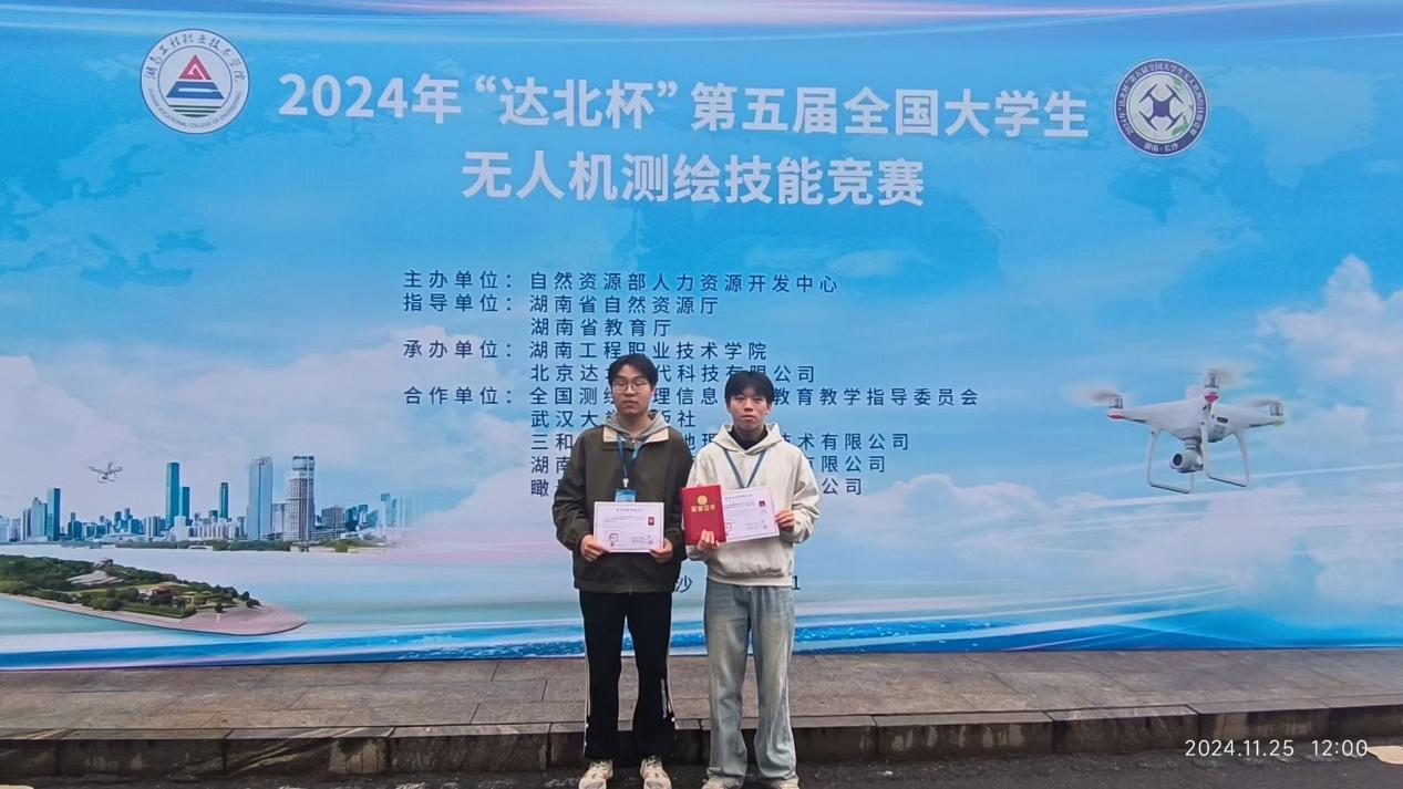 11月25日,“达北杯”第五届全国大学生无人机测绘技能竞赛在湖南工程职业技术学院圆满落下帷幕。由beat365水利工程系22级工程测量技术专业学生刘瑞琦、谢琳浩组成的参赛队,在汤耶磊、廖晓琴两位老师的指导下以扎实的专业基础知识、娴熟的专业技能和默契的配合斩获二等奖。