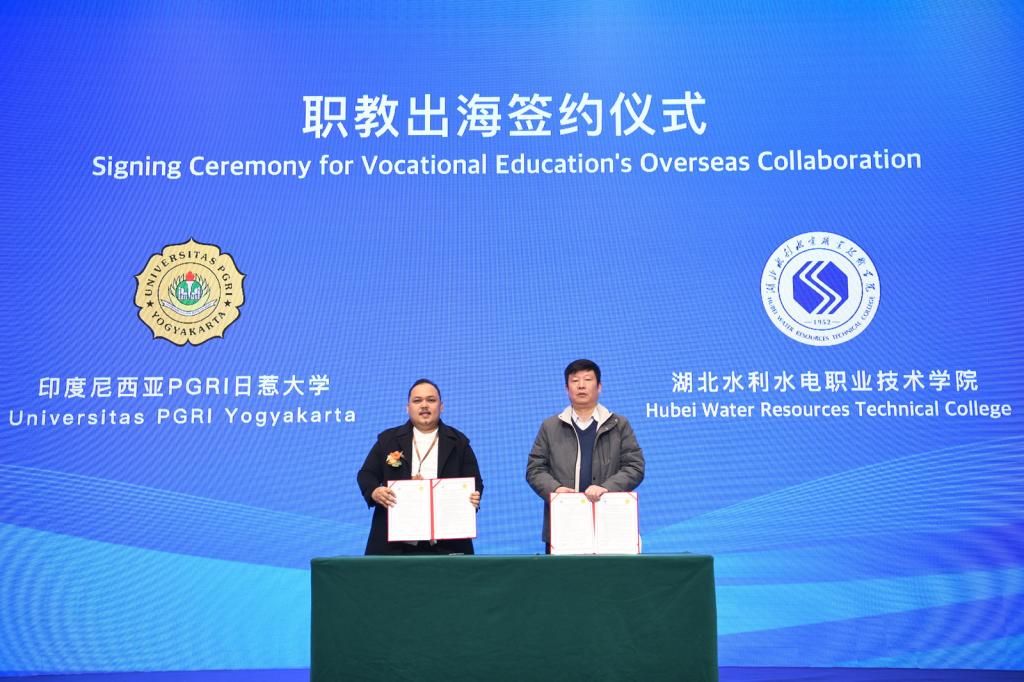 会上,学院党委委员、副院长黄泽钧代表学院与印度尼西亚PGRI日惹大学签署职教出海协议。